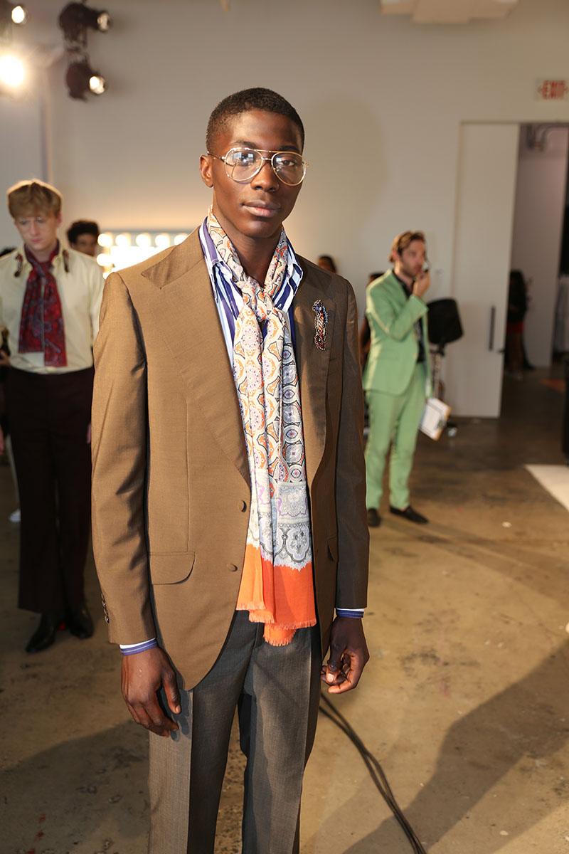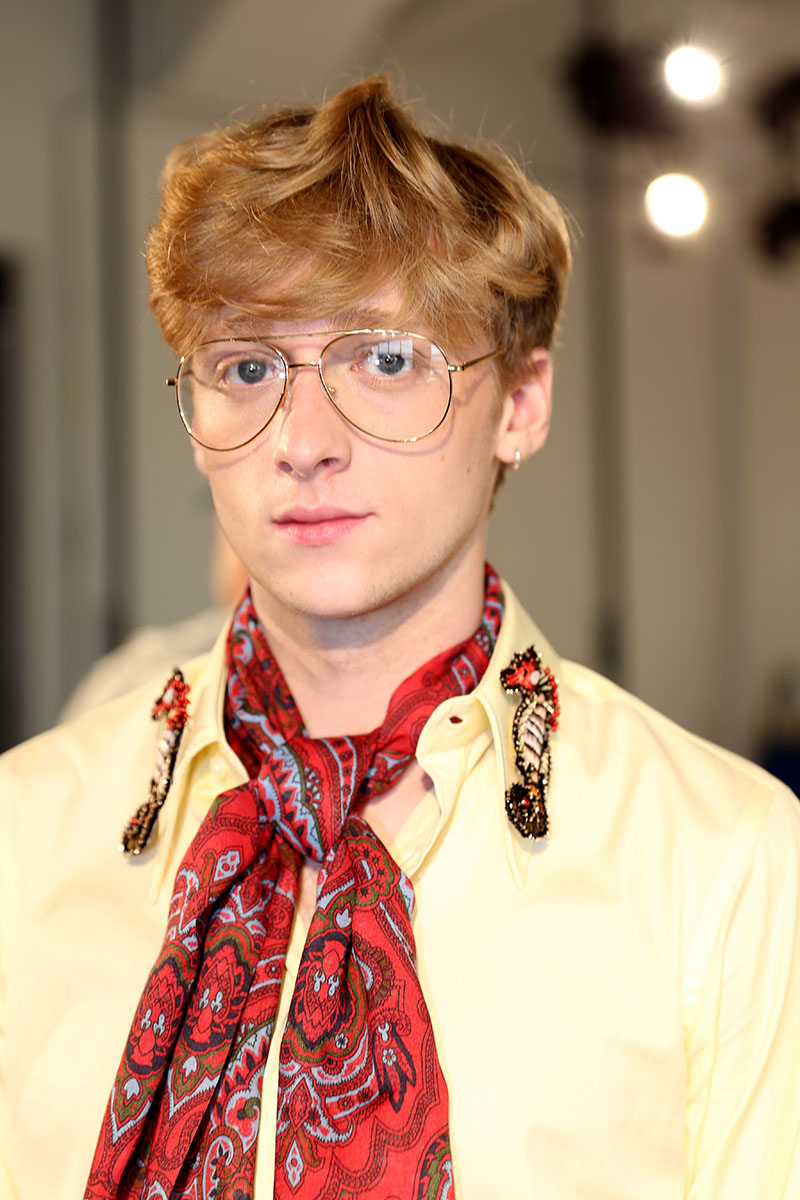Entre las prendas mas representativas destacaría los polos de punto con bloques de colores con ese rollo retro característico de la época, los estampados de las bufandas, las pajaritas (corbatines), y el ojo creado por la diseñadora de joyas Celeste Mogador que junto con los pantalones plisados bota campana, las camisas Albini con cuellos exagerados y con volantes y las solapas adornadas con terciopelo nos evocaron las ultimas colecciones de Alessandro Michele para Gucci.