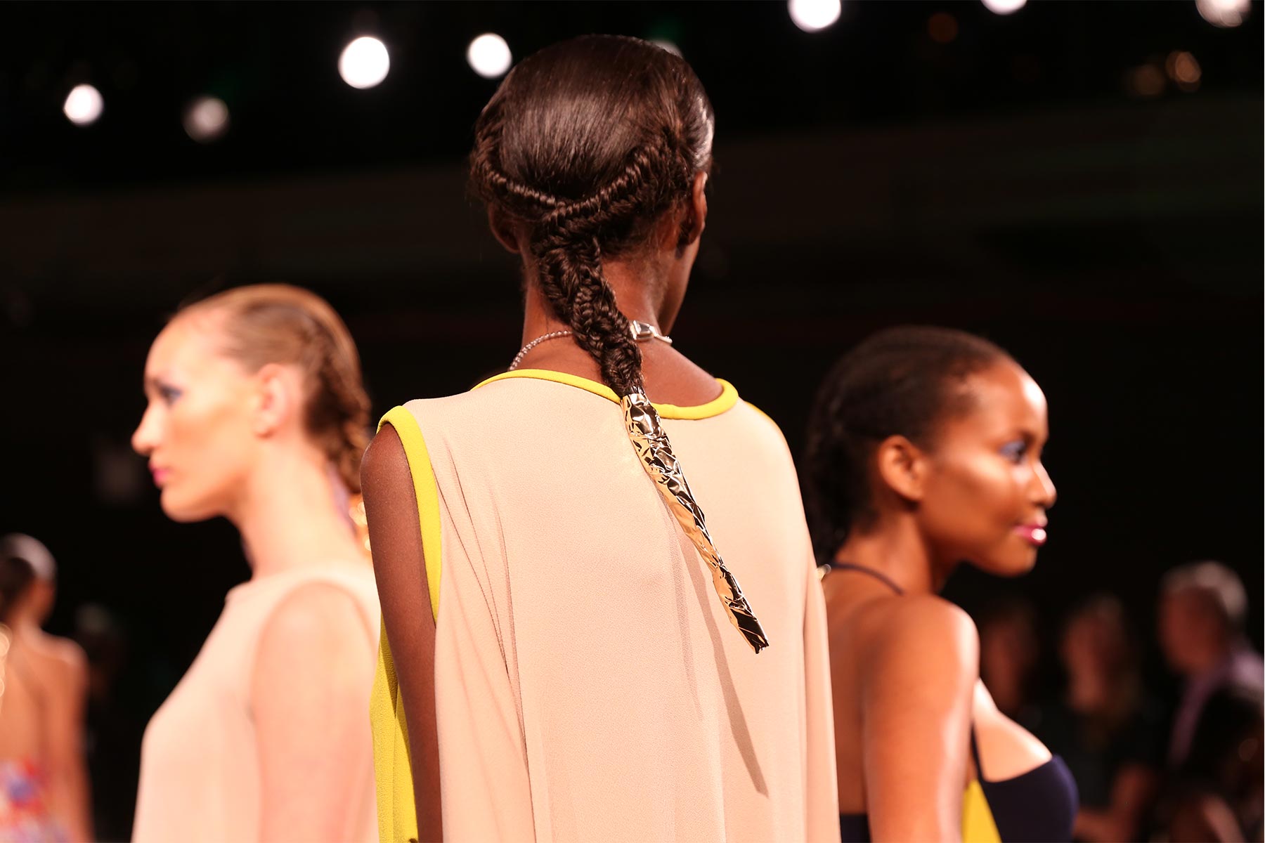 To complete the collection, the jewelry the goddesses had on were stunning. Chunky frosted matte Lucite necklaces dazzled our eyes as you walked from model to model. With their hair slicked back, a natural looking face of makeup, and bold open toe snake-skin heels, the essence of Spring/Summer was captured. Too bad ladies have to wait until Spring for this collection, after seeing the presentation who wouldn’t want to strut the white sands of Saint-Tropez in one of Czar’s designs.