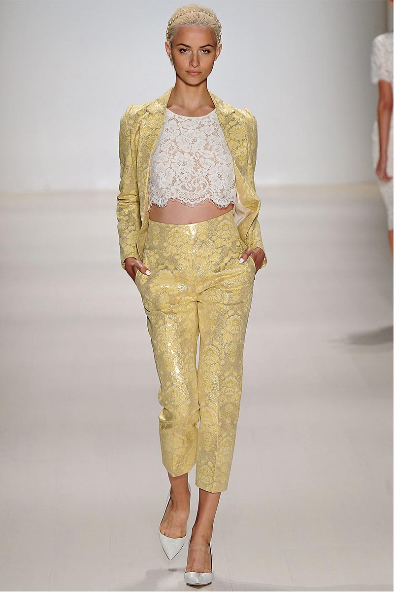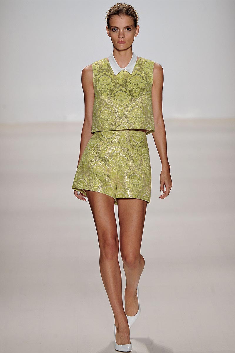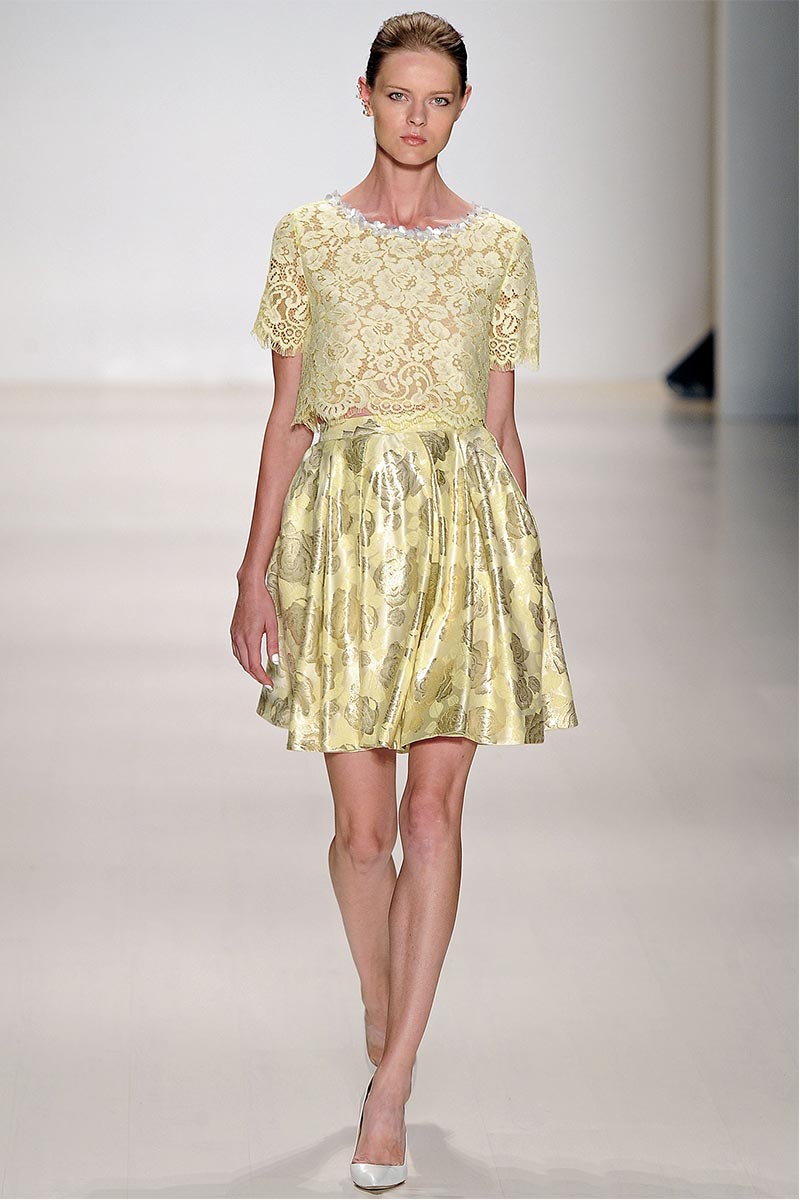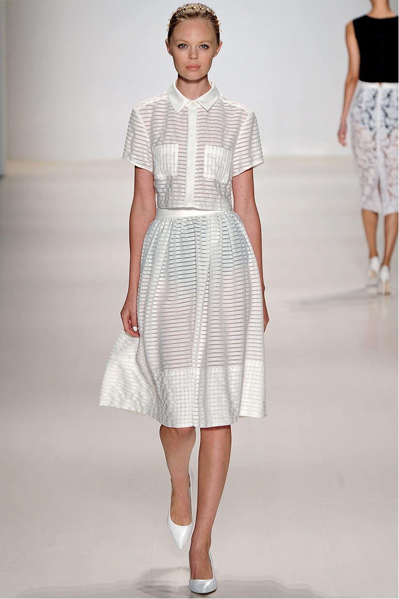 Charmed, I’m sure … Why yes! I definitely was when Erin Fetherston’s spring collection graced the runway. For a few seasons she has shown her designs in presentations; however, this season she wanted to see our expression as her collection did the moving around. And let me tell you, I fell in love. From the moment that pristine white neoprene crop top and almost ankle-length green and pink floral print neoprene skirt hit the catwalk, I salivated, and I’m not even a woman!