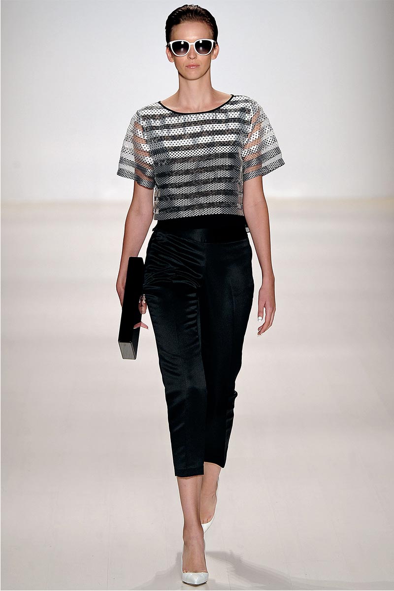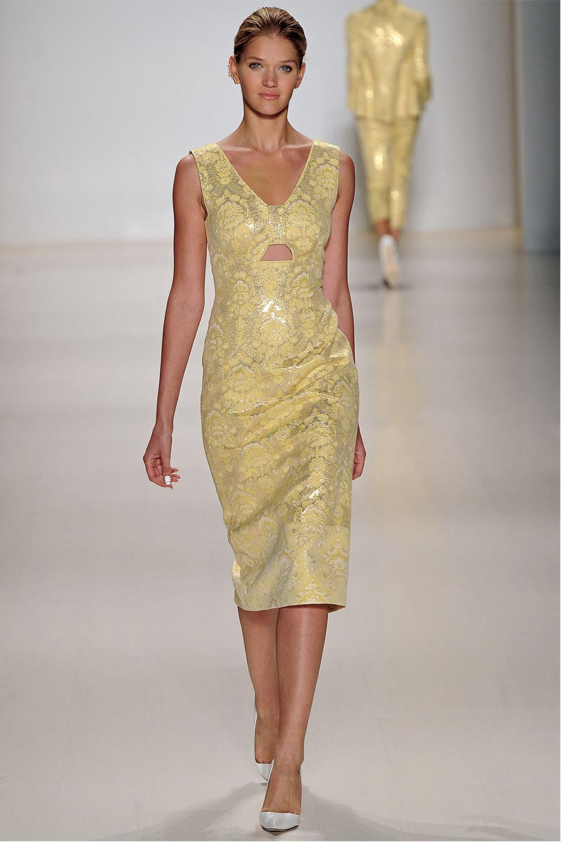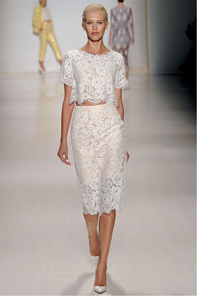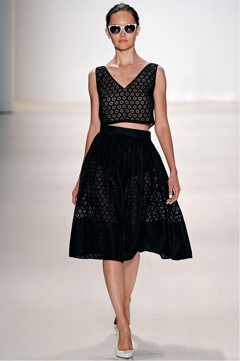 Charmed, I’m sure … Why yes! I definitely was when Erin Fetherston’s spring collection graced the runway. For a few seasons she has shown her designs in presentations; however, this season she wanted to see our expression as her collection did the moving around. And let me tell you, I fell in love. From the moment that pristine white neoprene crop top and almost ankle-length green and pink floral print neoprene skirt hit the catwalk, I salivated, and I’m not even a woman!