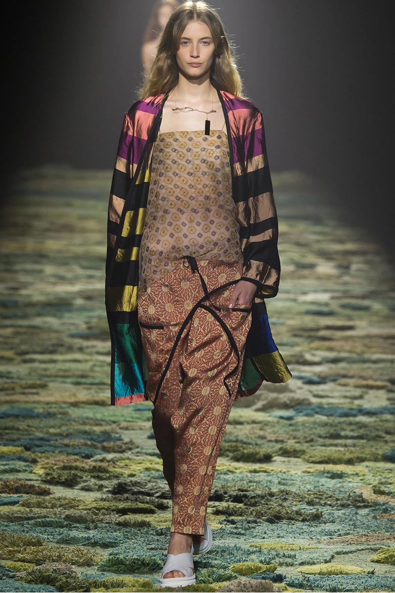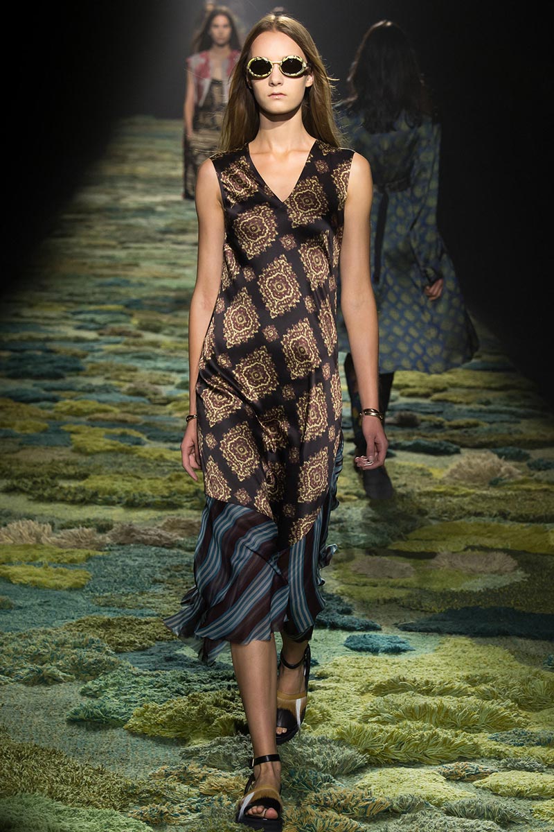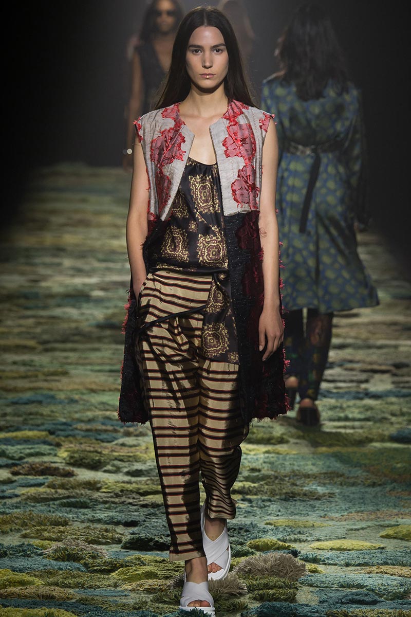 The grass tickled my bare feet and wind softly blew on my face as I skipped through the lush verdant untouched forest trying to find the perfect spot to settle down with my oversized blanket. Hypnotized by a sweet fragrance, I laid my blanket out and took a seat by a fallen trunk with wild flowers blooming out of its decaying orifice. All around me large, rich pillars loomed above me to a majestic canopy. Cracks of light broke through in a golden stream from the heavens and kissed parts of a multitoned moss filled trail outlined by robust trunks, wild flowers, and… I quickly smacked myself into reality and focused on the clothes peacefully gracing the runway. Dries Van Noten has always been successful in transporting his spectators to a different world with his settings through use of music, lighting, and props. This year was no different, with the sound of birds chirping and the blowing of gentle winds playing in the background, along with a custom made carpet by Argentinean artist Alexandra Kehayoglou mimicking a moss trail, and dusky golden lighting mimicking sunlight seeping through a dense canopy, it was no surprise my enchanted senses placed me in a lush dreamlike forest for the show.