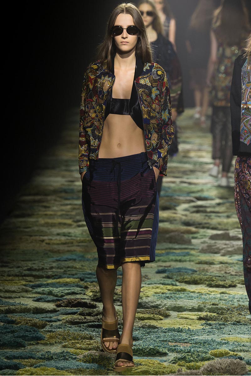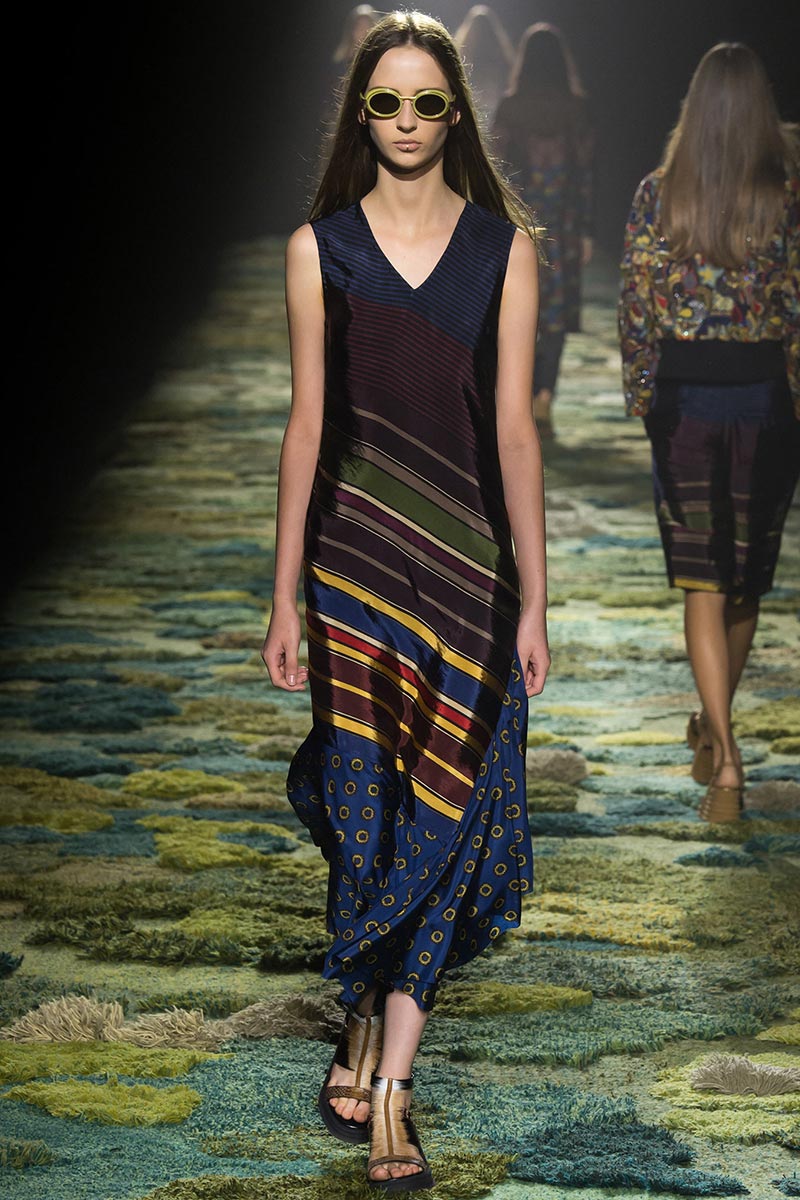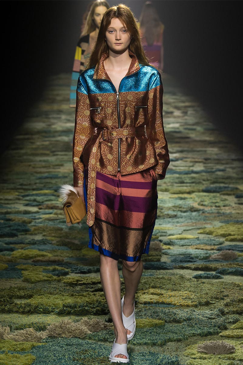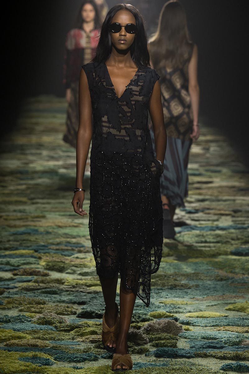 The grass tickled my bare feet and wind softly blew on my face as I skipped through the lush verdant untouched forest trying to find the perfect spot to settle down with my oversized blanket. Hypnotized by a sweet fragrance, I laid my blanket out and took a seat by a fallen trunk with wild flowers blooming out of its decaying orifice. All around me large, rich pillars loomed above me to a majestic canopy. Cracks of light broke through in a golden stream from the heavens and kissed parts of a multitoned moss filled trail outlined by robust trunks, wild flowers, and… I quickly smacked myself into reality and focused on the clothes peacefully gracing the runway. Dries Van Noten has always been successful in transporting his spectators to a different world with his settings through use of music, lighting, and props. This year was no different, with the sound of birds chirping and the blowing of gentle winds playing in the background, along with a custom made carpet by Argentinean artist Alexandra Kehayoglou mimicking a moss trail, and dusky golden lighting mimicking sunlight seeping through a dense canopy, it was no surprise my enchanted senses placed me in a lush dreamlike forest for the show.