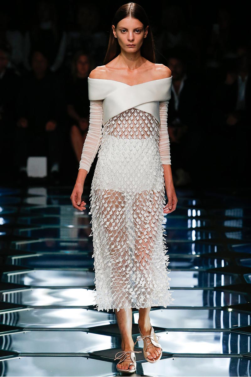 Dense techniques of embellishment married the opulence and exuberance that Wang wanted to accomplish within the austere-purity of the house archives, giving as result tone-on-tone decorations that upraised the casual aspect of the pieces. Likewise, details like the arresting dynamic-movement seen on the skirts with little rhombic fabric-tiles stitched over the same sheer, geometric-pattern, indicate craftsmanship as new addition into Wang's new language for Balenciaga. That attention to precision is evident in the way the aforementioned little rhombic-shapes were laser cut-out-of organza, leaving negative spaces that were intricately beaded to offer tridimensionality. The beaded work in lattice pattern, used for a long-sleeve top with strapless-corset overlay as one piece (that model Hanne Gaby sported towards the end), was also a clear-cut.