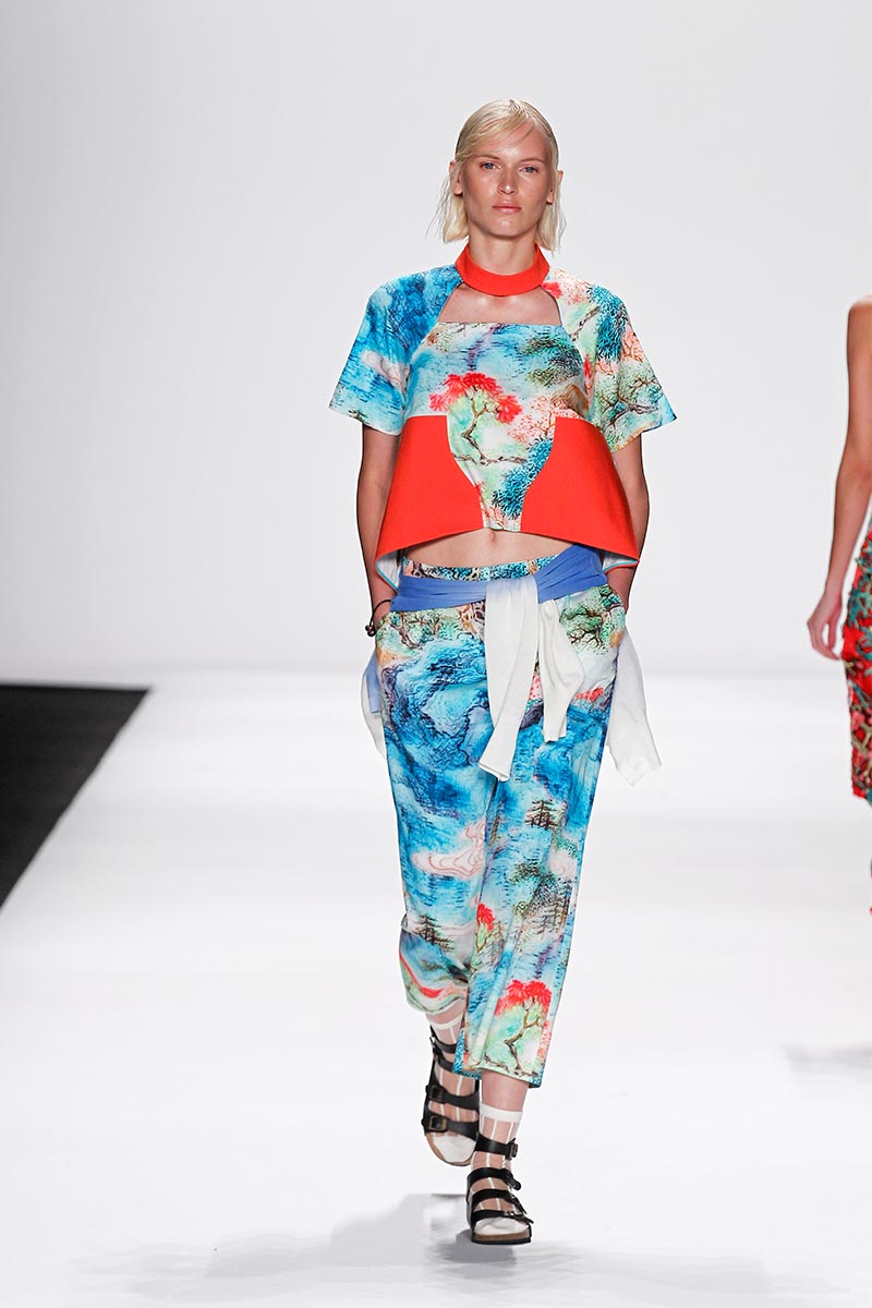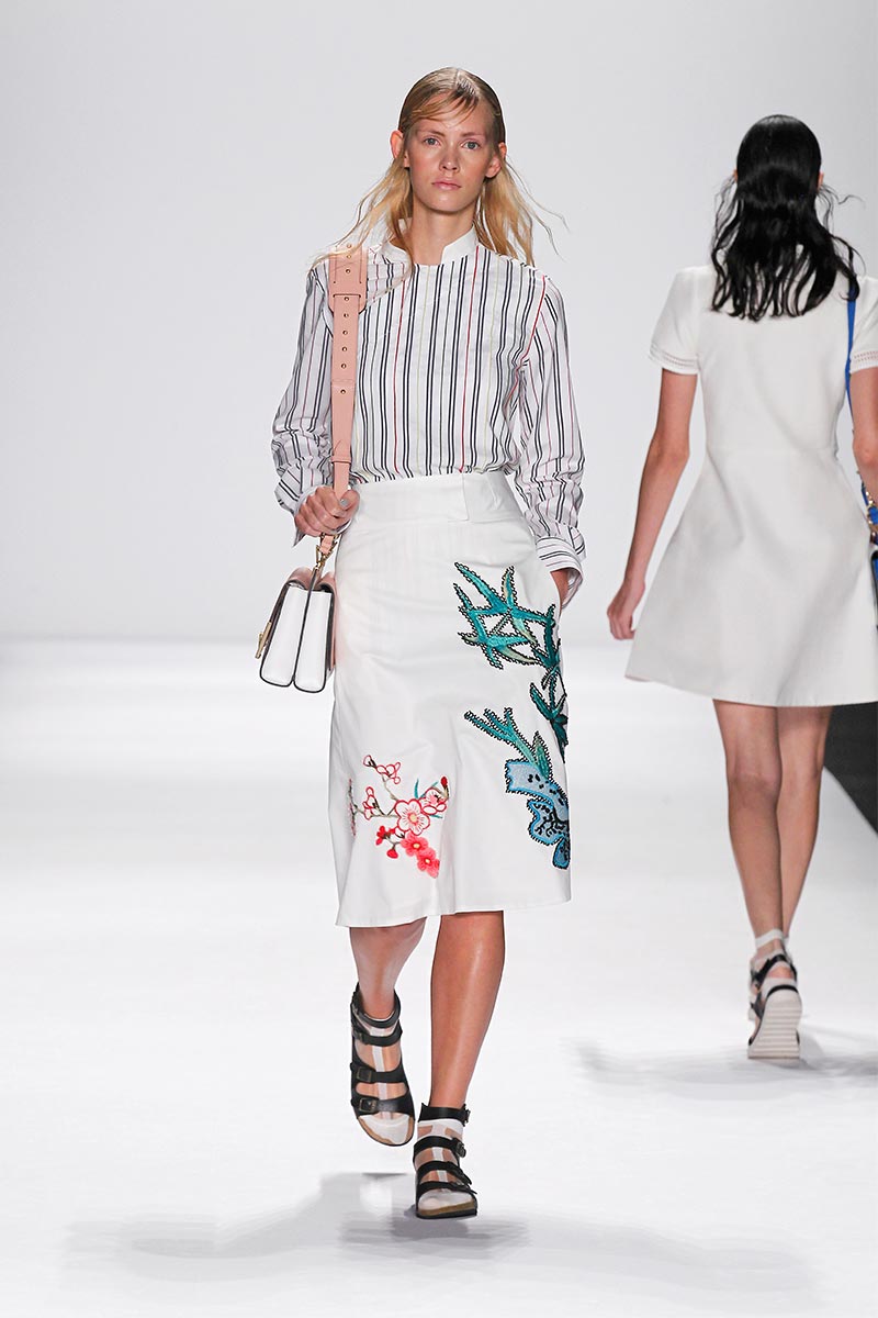 Every look evolved into the next one, reflecting the free spiritedness of the 60s and 70s through a-line silhouettes, shift dresses, mini skirts, bermuda shorts and pajama pants that transited between landscapes, tidal waves, and scenes from nature. A strong, dynamic feel propelled by the runway's soundtrack that pulled spectators into Tam's creative passage. Prints and boyish overlays iterated a modern context, combined with feminine expressions of embroideries and definitive sneak cut outs that scented a polished and refined craftsmanship.